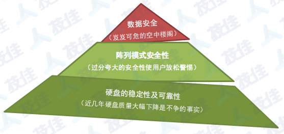 从上述成功案例中可以看出,Raid故障通常表现为两块或多块硬盘离线(或亮灯报警),Raid无法正常运行从而造成数据丢失,实际案例中,95%以上的RAID-5故障表现为两块硬盘离线,且其中一块硬盘往往已离线很久。既然RAID针对数据安全提供了不同的容灾手段,为什么还会发生数据丢失?由图3可以看出,数据安全是建立在"硬盘稳定可靠"及"阵列模式安全稳定"两个基础上,它们任何一项出现问题,数据安全就成了岌岌可危的空中楼阁。 (1)磁盘的稳定性及可靠性。这是所有磁盘介质内数据安全的基础,希捷7200.11代硬盘"固件门"事件,让人们开始关注机械硬盘质量对于数据安全的影响。而近几年,随着高密度硬盘普及,厂商为压缩成本,缩减对硬盘质量的把控,造成市面上硬盘质量整体下滑,很多硬盘仅使用几个月就出现故障,在这种前提下,即使采用最安全的阵列模式,数据丢失也不可避免。 (2)阵列模式的安全性。几种主流RAID级别经过多年发展,已非常稳定,但这种安全性被过分夸大后,就会给用户造成"Raid是100%安全"的错觉,使用户放松警惕。当阵列中一块硬盘出现故障,Raid仍可正常运行,多数用户不会及时排除故障,当第二块硬盘发生故障后,RAID机制丧失,阵列崩溃,此时才开始补救,为时已晚。