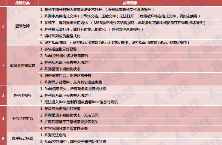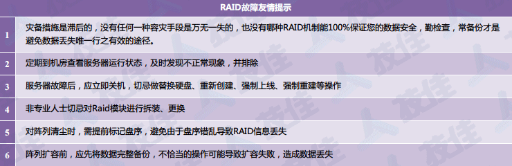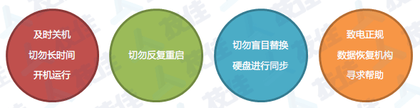 1. 及时关机,切勿长时间开机运行。由于服务器(Raid阵列)多采用高性能SAS硬盘,转速可达10000RPM甚至15000RPM,在实际案例中,经常遇到用户不及时断电,导致碟片与磁头长时间接触,使磁粉脱落,造成数据无法恢复的重大损失。因此,服务器(Raid阵列)发生故障后,应及时关机,切勿反复开机尝试。 2. 切勿反复重启。Raid(尤其Raid-5或Raid-6)无法运行时,故障现象通常表现为两块或多块硬盘离线,而其中一块硬盘往往已离线很久,有时这块硬盘是由于逻辑原因离线,而重启后,该硬盘上线参与同步操作,造成阵列数据"污染"。 3. 切勿盲目更换硬盘进行同步操作。由于Raid的容灾机制,及时将故障硬盘替换后,Raid会自行完成同步操作。但实际案例中,同步没有完成,其它硬盘又离线 4. 致电正规数据恢复机构寻求帮助。目前中国数据恢复市场鱼龙混杂,不同恢复机构的技术水平和职业素质千差万别,正规机构价格较高,但成功率很高,用户应慎重选择,切勿贪图便宜造成无法挽回的损失。