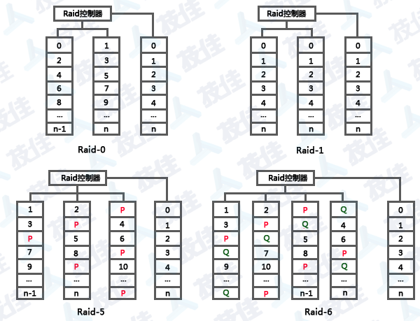 RAID(独立冗余磁盘阵列)是大数据时代最好的存储手段,它既解决了单块硬盘容量无法达到使用要求的问题,又提供了不同级别的灾备措施,用户可根据需要灵活定制适用的阵列模式来存储大容量数据,常见的阵列方式有以下几种: